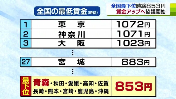 政府は現在の全国平均時給961円を1000円に引き上げることを目標としています。ただ、現在1000円を超えているのは、東京、神奈川、大阪の3都府県のみで、東北では宮城県の883円が最も高く、青森県の853円は、秋田や熊本、沖縄と並んで全国最下位です。