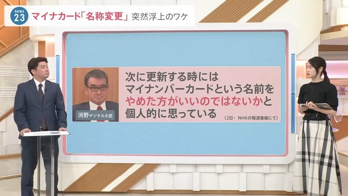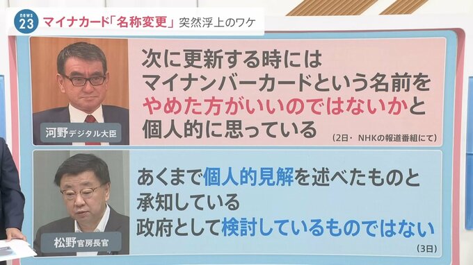 一方で河野大臣ですが、デジタル庁としてはマイナンバーカード誕生から10年が経ち、更新を迎える2026年に新しいカードを発行しようという話が出ています。このタイミングで“名称変更”はどうだろうという検討事項もあがっていて、河野大臣も同様の発言をしています。それがはたから見ると、閣内不一致のように映るのではないでしょうか。