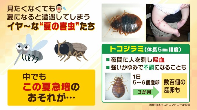 トコジラミに要注意。夜間に活動して、寝ている間に人を刺し吸血。ひどいかゆみから体調不良になることもあるということです。駆除は専門業者にお願いするか、殺虫剤をまくことすすめるのは害虫防除技術研究所の白井良和所長。「血が混じった血糞を見つけたらトコジラミが潜伏しています」と。