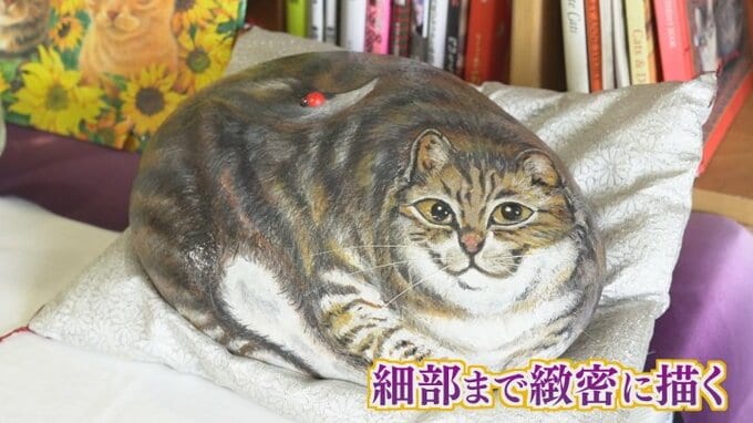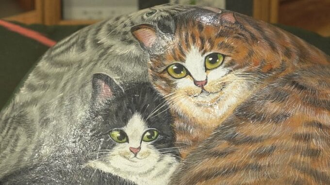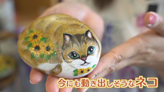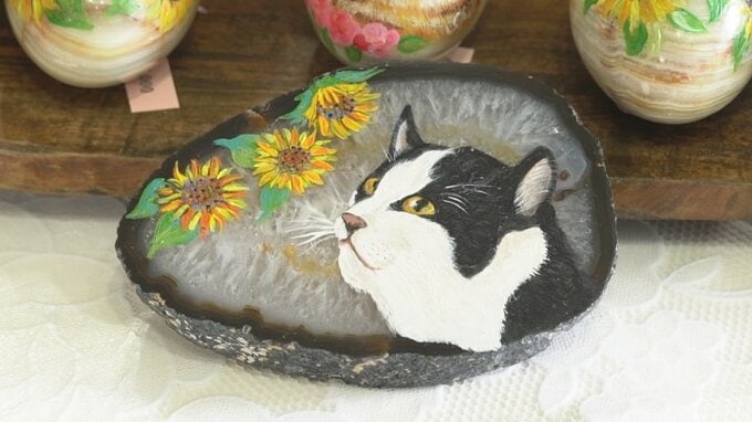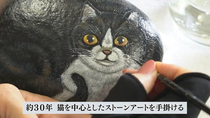 天野さんのストーンアートは細部まで緻密に描かれているのが特徴。ネコの毛並みまで細い筆で忠実に再現しています。