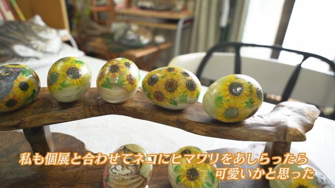 天野さんが作られたストーンアートの作品は、今にも動き出しそうなネコとともにウクライナの国花であるヒマワリが描かれています。