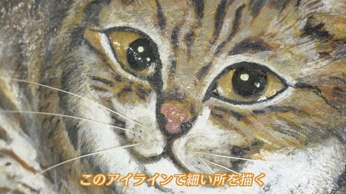 筆を持つという共通点がある。猫ちゃんの一番の魅力は目。このアイラインの細い所を描くのが、人間の顔のメイクと石にメイクするというのと共通点があるような気がする。