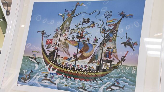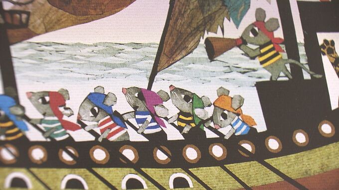 新作版画の「ねずみの海賊船」は、ネズミ年生まれの藤城さんが8回目の年男を迎えたことを記念して制作した作品だといいます。