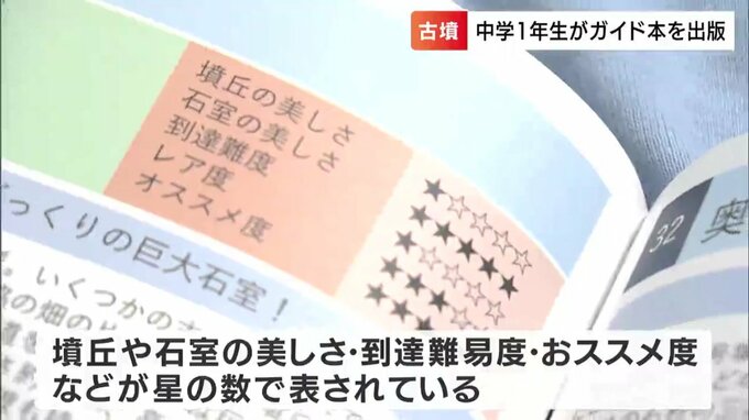 パソコンソフトを使って原稿を書き込み、撮影した写真をレイアウトするなど、自ら編集。両親が校正を手伝うなどして、約1年半で完成しました。「古墳の美しさ」や「古墳にたどり着くまでの難しさ」など、自分の足で調べた古墳の魅力を、星の数で採点しています。