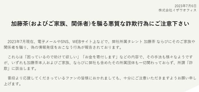 その内容については『「困っているので助けて欲しい」「お金を寄付します」などの内容で、その手法も様々なようですが、いずれも加藤茶本人およびご家族、ならびに弊社も含めたその所属団体も一切関わっておらず、所謂「詐欺」に該当します』と警告しています。
