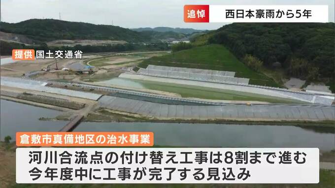 真備地区では、堤防の決壊を防ぐために進められている小田川と高梁川の合流点の付け替え工事が8割まで進んでいて、今年度中に完了する見込みです。