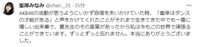 峯岸みなみさんは「AKB48の活動が思うようにいかず自信を失いかけていた時、『峯岸はダンスの才能がある』と声をかけてくれたことがそれまで生きてきた中でも一番に嬉しい出来事で、夏先生のその言葉があったから私は今もこの世界で頑張ることができています」と思いを込めています。