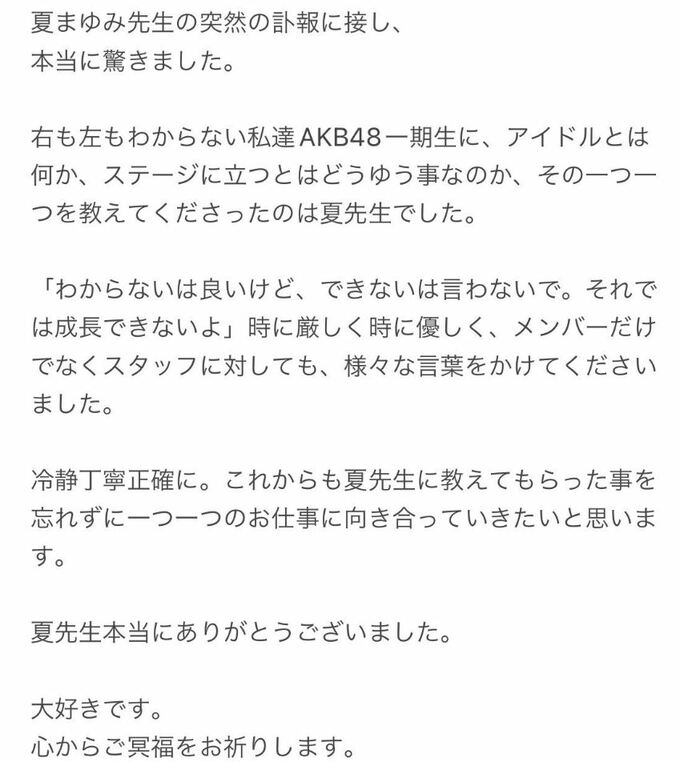 高橋みなみさんは「右も左もわからない私達AKB48一期生に、アイドルとは何か、ステージに立つとはどうゆう事なのか、その一つ一つを教えてくださったのは夏先生でした」と振り返り、「『わからないは良いけど、できないは言わないで。それでは成長できないよ』時に厳しく時に優しく、メンバーだけでなくスタッフに対しても、様々な言葉をかけてくださいました」と印象強かった会話を綴っています。