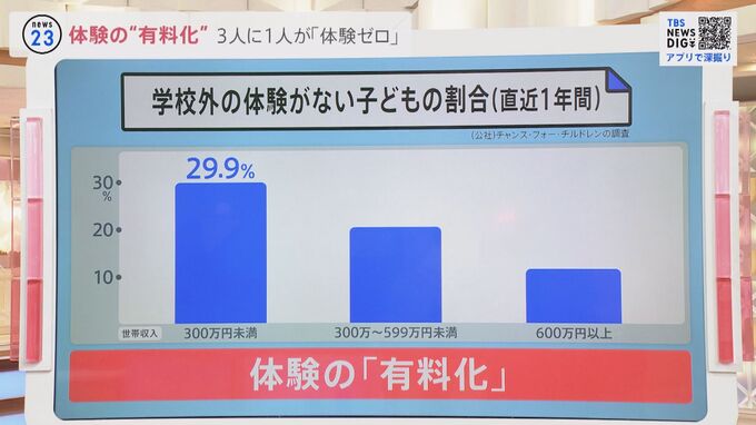 データを見てみますと、世帯収入300万円未満の家庭では、約3人に1人の子どもが学校以外の体験がゼロだということです。この背景にあるのが体験の「有料化」だということです。