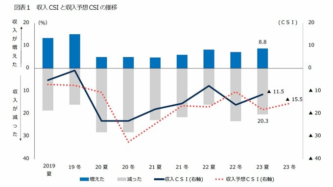 一方で、今後の先行きを占める収入予想はマイナス15.5と、現在よりも4ポイント低く、先行きは不透明と考えている人が多いとみられています。