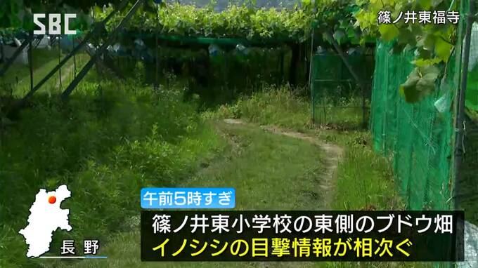 イノシシが目撃されたのは、長野市の篠ノ井東小学校の東側にあるブドウ畑で、7日午前5時過ぎから30分ほどの間に目撃情報が相次ぎました。
