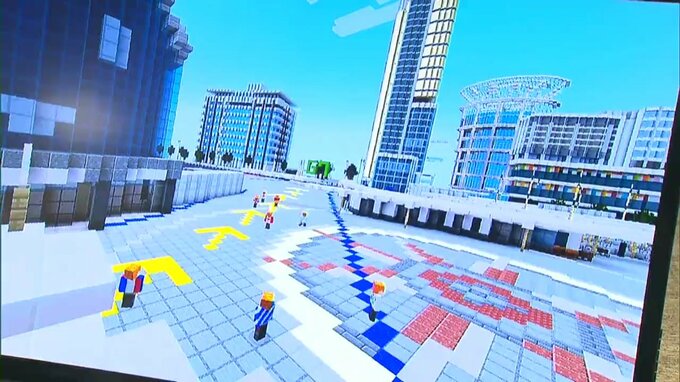 園内の商工奨励館では仮想空間にサンポート高松が再現され、閣僚たちは自分のアバターを操作して記念撮影を行いました。