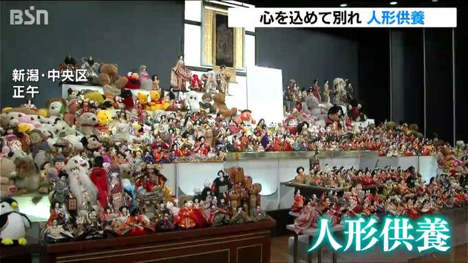 新潟県と山形県の12会場で子どもの成長を願ったひな人形や、心を癒してくれたぬいぐるみなど1万体以上が持ち込まれ、人形たちとの別れとして心を込めて供養されました。