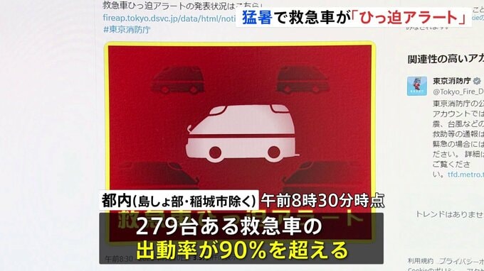 きょう都内では救急車の出動率が90%を超え、東京消防庁が今月から運用を始めた「救急車ひっ迫アラート」を初めて発表しました。東京消防庁は都内(島しょ部・稲城市除く)に279台ある救急車の出動率が午前8時30分…