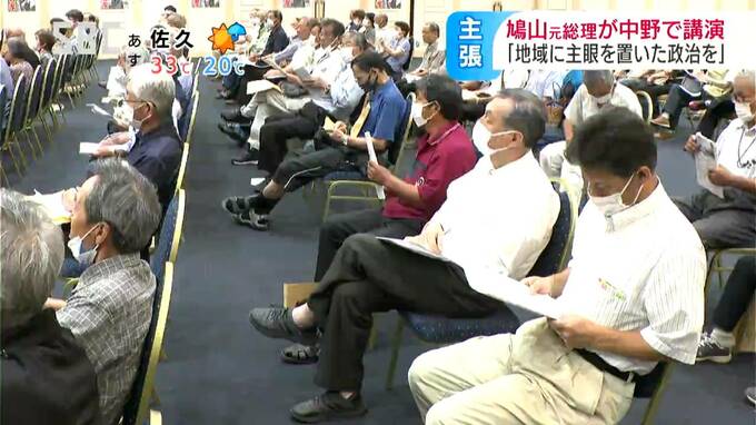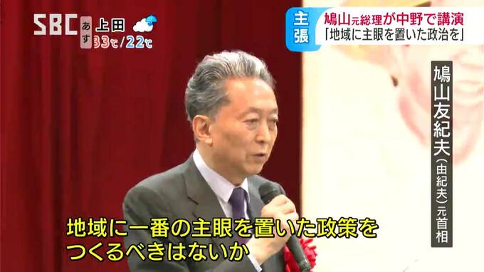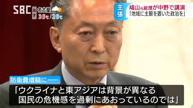 民主党政権で総理大臣を務めた鳩山友紀夫(はとやま・ゆきお)さんが中野市で講演し、岸田政権の防衛費増額を批判した上で、より地域に主眼を置いた政治を進めるべきと提言しました。