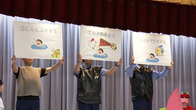 昔話「桃太郎」をアレンジした演劇が披露され、子どもたちは「1人で海や川に近づかない」ことや「友達が溺れたときは大人を呼ぶ」ことなど、水遊びをするときの注意事項を学びました。