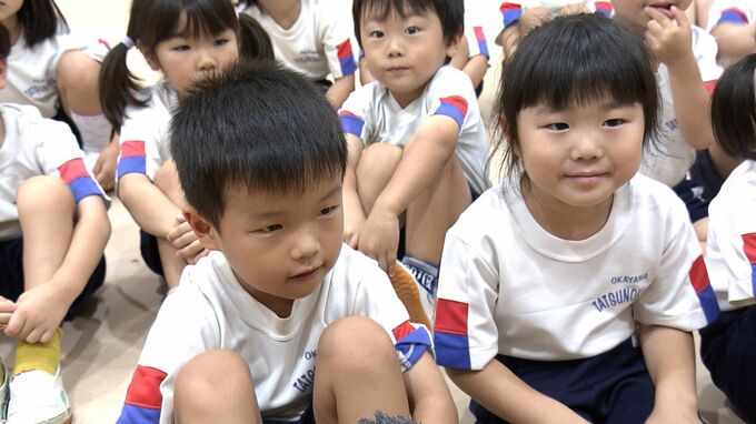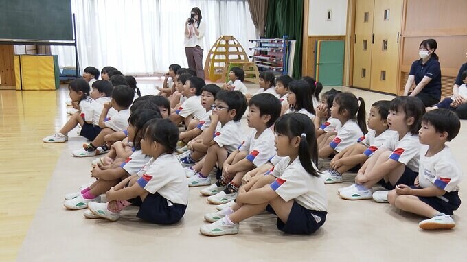 岡山市中区の竜之口(たつのくち)保育園で行われた、水難事故防止教室です。夏の時期に増える水の事故を未然に防ごうと、岡山中央警察署が開きました。