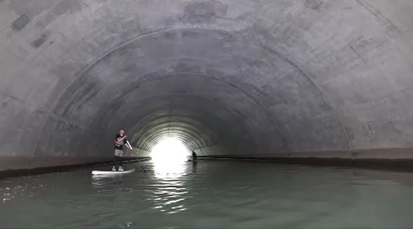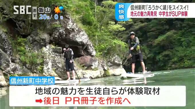 信州新町中学では、地域の魅力を生徒自らが体験取材しPR冊子を作る計画で、サップ体験もその取り組みの一環です。