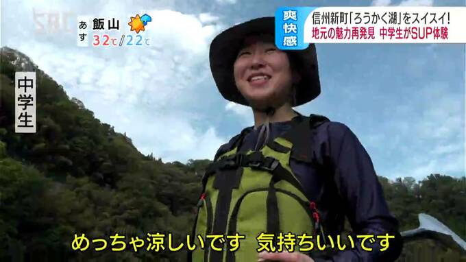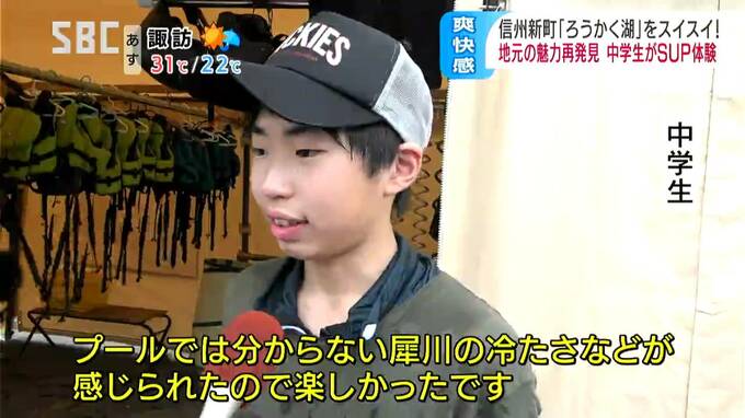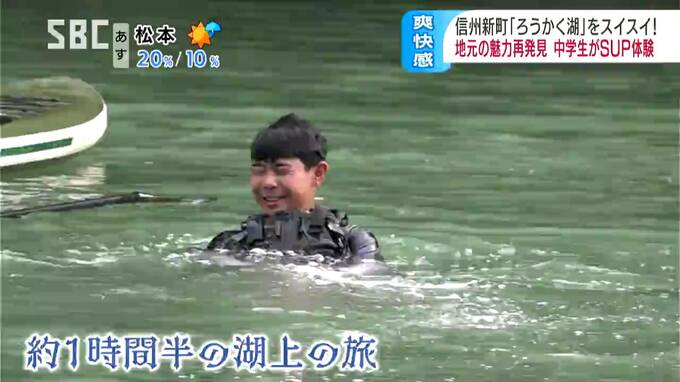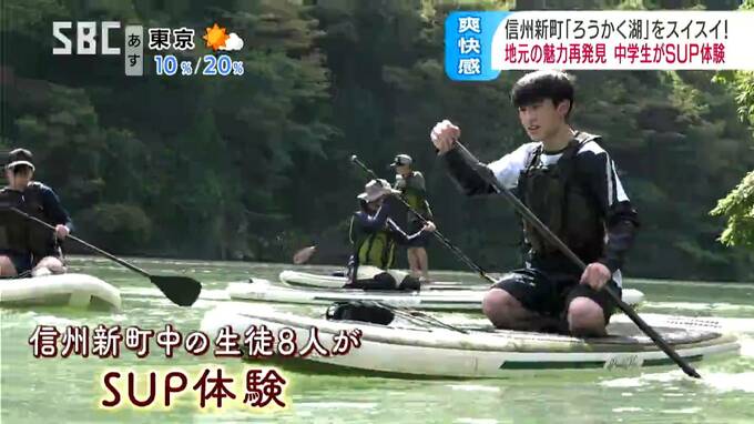 エメラルドグリーンの「ろうかく湖」で、信州新町中学校の生徒8人がサップを体験しました。
