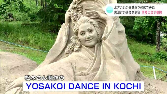 高知県内ただ一人の砂像彫刻家、松木由子(まつぎよしこ)さんがこのほどフィンランドで行われた国際大会で見事、優勝しました。世界の頂点に立った作品は「よさこいの躍動感」を表現した砂像です。砂と水だけで造…
