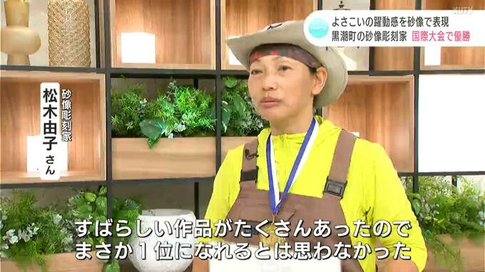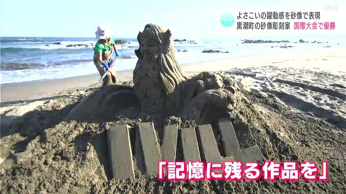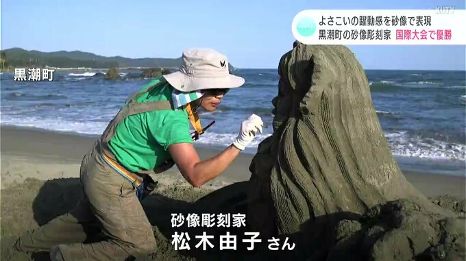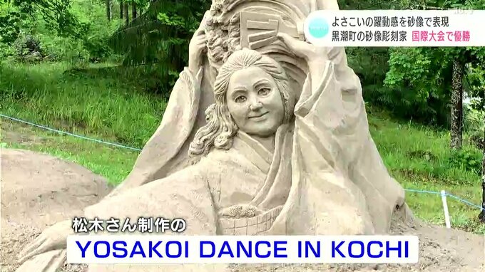 高知県内ただ一人の砂像彫刻家、松木由子(まつぎよしこ)さんがこのほどフィンランドで行われた国際大会で見事、優勝しました。世界の頂点に立った作品は「よさこいの躍動感」を表現した砂像です。