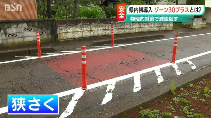 今回、設置された物理的デバイスのひとつ『狭さく』です。道路の両脇にポールを立て、道幅を狭くすることでドライバーに減速を促します。さらに…