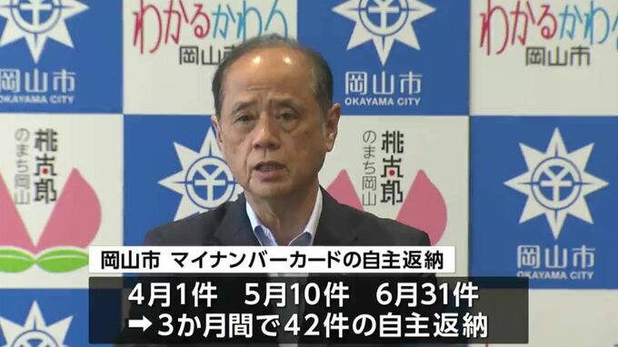 きょう(11日)の市長会見で明らかにされたものです。岡山市によりますとマイナンバーカードの自主返納は4月に1件、5月に10件、6月に31件と3か月間で合わせて42件あったということです。