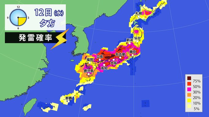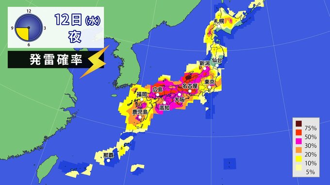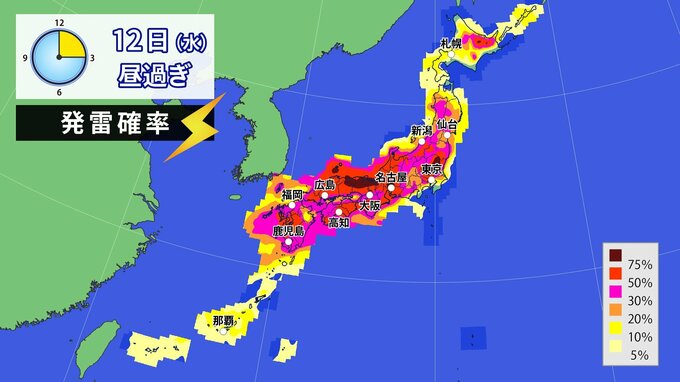 梅雨前線が12日にかけて北上しながら北日本にのびるため、暖かく湿った空気が西日本から北日本に流れ込む見込みです。さらに12日午後には、日本海の上空約5500メートルに氷点下6度以下の寒気を伴う気圧の谷が進み、日中の気温の上昇も加わって、西日本から北日本の広い範囲で大気の状態が非常に不安定になるとみられます。※【写真】に発雷確率の連続画像