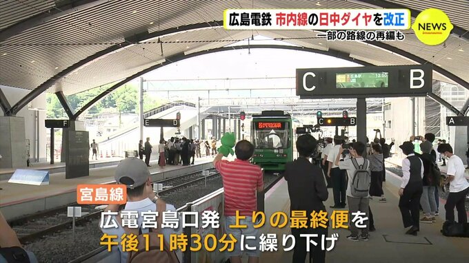 一方、宮島線では、広電宮島口発上りの最終便を現行より1時間遅い23時30分に繰り下げます。