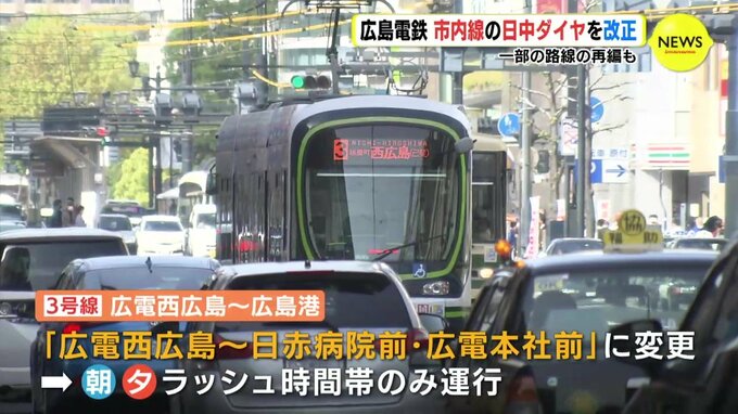 広島電鉄が今月24日に実施するダイヤ改正では、広電西広島と広島港を結んでいる3号線は、行き先を日赤病院前と広電本社前に変更したうえで、運行も朝・夕のラッシュ時間だけになります。これにより上下合わせておよそ64便の減便となります。