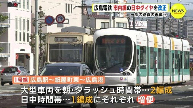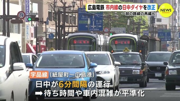 これにより、紙屋町から広島港までの宇品線は、日中が6分間隔の運行となり、待ち時間や車内混雑が平準化されるとしています。