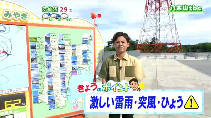 7月12日水曜日、宮城の30秒天気です。tbc気象台、今野桂吾気象予報士がお伝えします。「きょうも県内は大気の状態が非常に不安定。次第に雲が増え、雷雨や突風、ひょうに注意が必要です。厳しい暑さが続くため、体…
