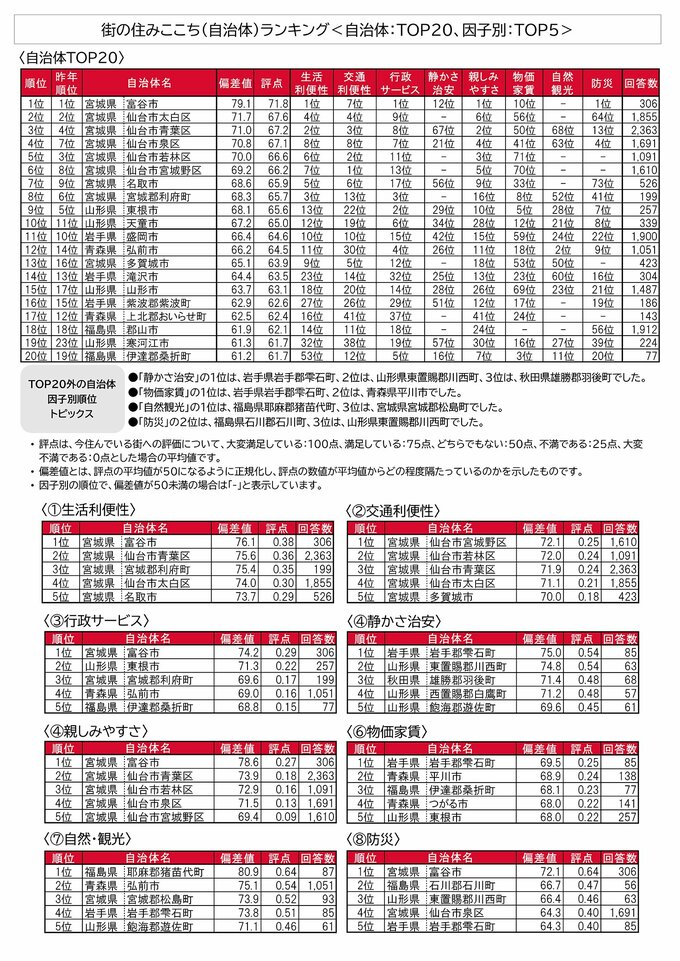 一方、「静かさ治安」「物価家賃」では岩手県雫石町が1位、「自然・観光」では、福島県猪苗代町が1位でした。