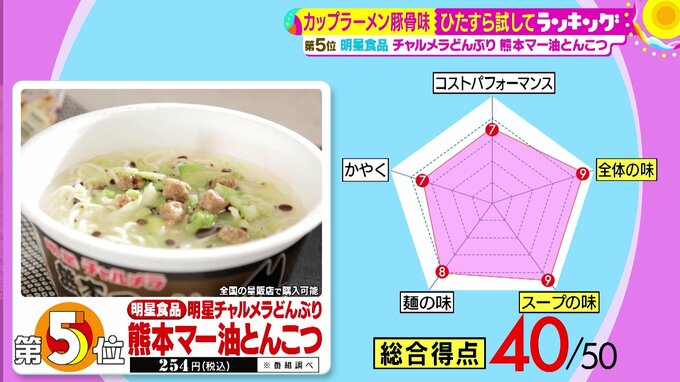 第5位は、明星食品の『明星 チャルメラどんぶり 熊本マー油とんこつ』(税込254円 ※番組調べ)。