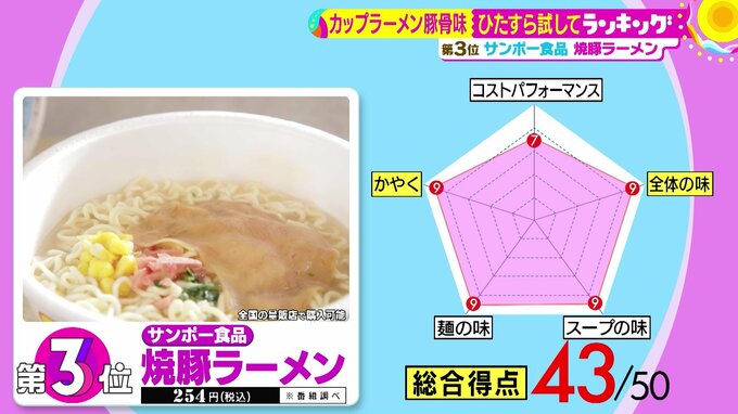 第3位は、サンポー食品の『焼豚ラーメン』(税込254円 ※番組調べ)。