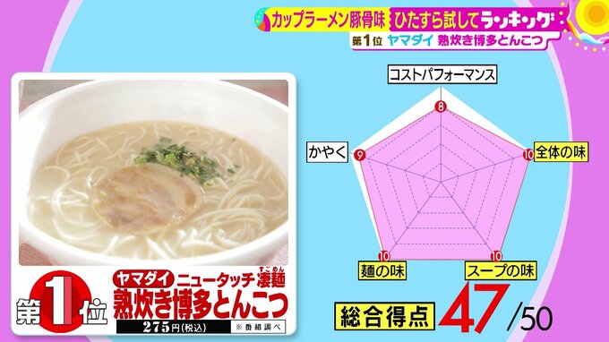 そして第1位は、ヤマダイの『ニュ ータッチ 凄麺(すごめん) 熟炊き博多とんこつ』(税込275円 ※番組調べ)。