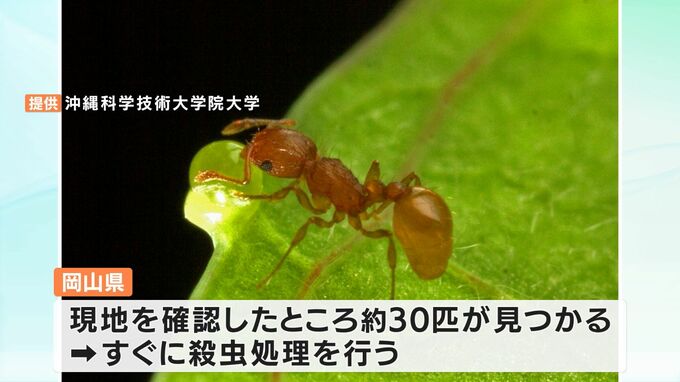 岡山県は今後、毎週監視を行うとともに、発見したら直ちに殺虫処理を行うとしています。また岡山県は県民に対して、見たことがない個体がいたら触らずに、現場の状況を連絡してほしいとしています。