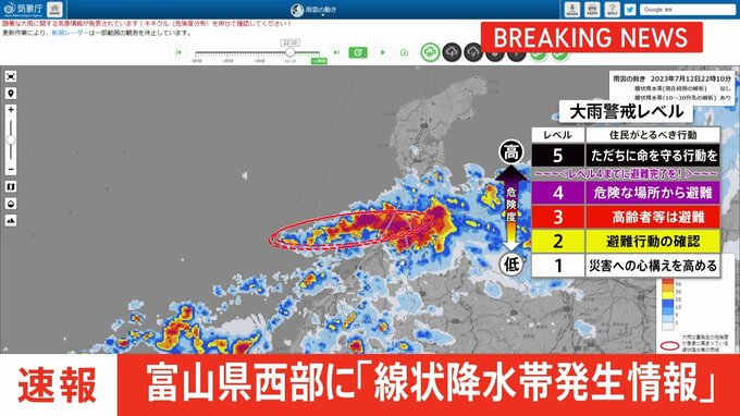 気象庁は午後10時9分、富山県に「線状降水帯発生情報」を発表しました。この情報が発表された地域では、線状降水帯によって非常に激しい雨が降り続き、土砂災害や浸水、河川の洪水など災害の発生する危険度が急激…
