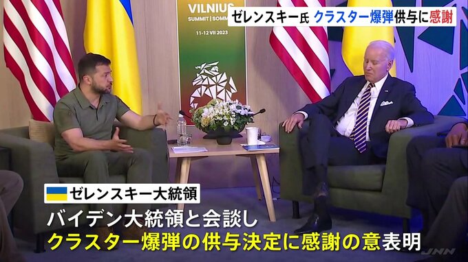 リトアニアを訪れたウクライナのゼレンスキー大統領がアメリカのバイデン大統領と会談し、クラスター爆弾の供与に感謝の意を伝えました。ウクライナ ゼレンスキー大統領「クラスター爆弾について難しい政治決断を…