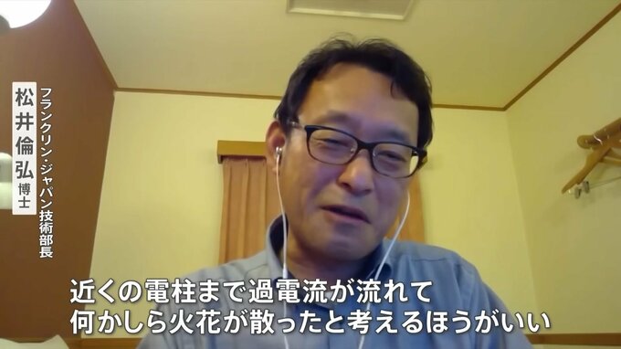 「近くの電柱まで過電流が流れて、何かしら火花が散ったと考えるほうがいい。特段珍しいことではない。電力会社は雷が落ちても、停電させないように設計している」