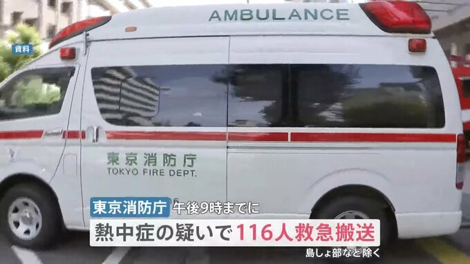 東京消防庁によると、午後9時までに116人が熱中症の疑いで救急搬送されました。