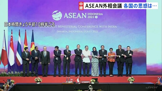 インドネシアできょうからASEAN=東南アジア諸国連合の関連外相会議が始まり、ウクライナ情勢や中国が軍事拠点化を進める南シナ海の問題などが焦点となります。現地から中継です。後ろに見えるが会場のホテルです…