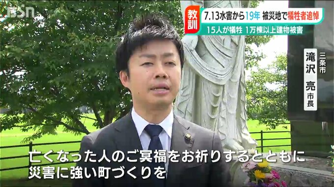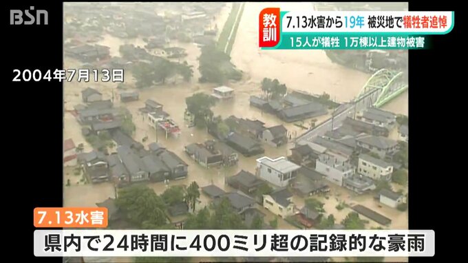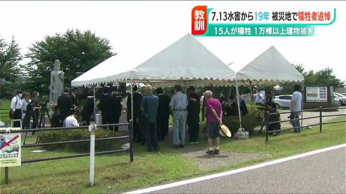 各地で豪雨災害が起こっていますが、新潟県内も19年前に豪雨による災害に見舞われました。15人が犠牲となった7.13水害です。13日、被災地では献花台が設けられ犠牲者を悼み、祈りが捧げられました。