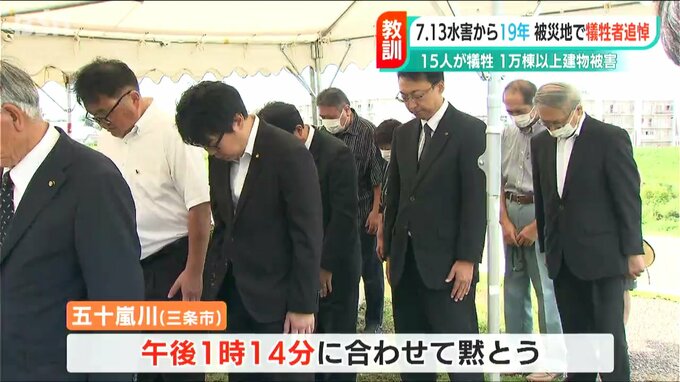 三条市の五十嵐川では、堤防が決壊した午後1時14分に合わせて、黙とうが捧げられました。