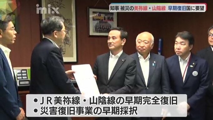 大雨で被災したJR美祢線や山陰線の早期復旧に向け、村岡嗣政・山口県知事が13日、国土交通省などを訪れ、支援を求めました。村岡知事は、JR美祢線や山陰線の沿線自治体の市長らと国土交通省を訪れ、斉藤鉄夫・国交…