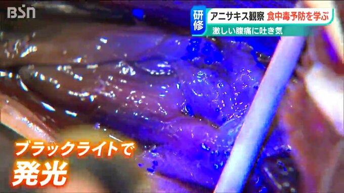 魚介類を食べた後に激しい腹痛や吐き気を引き起こす寄生虫=「アニサキス」について、魚を提供する飲食店経営者らが、生きているアニサキスを観察し、食中毒の予防を学ぶ研修会が開かれました。