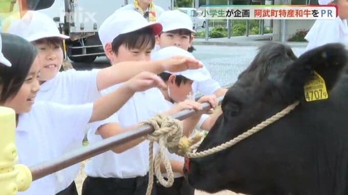 山口県阿武町の小学生が13日、地元の特産で「幻の和牛」とも言われる無角和牛を道の駅でPRしました。