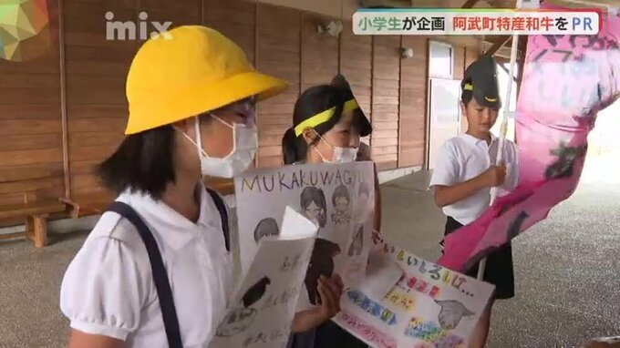PRしたのは、阿武小学校の5年生19人です。道の駅阿武町で、買い物客に手作りのチラシやパンフレットなどを配って無角和牛の魅力を伝えていました。児童たちは、総合的な学習の授業で無角和牛を学んでいて、PRはその成果を発表しようと自分たちで企画したものです。