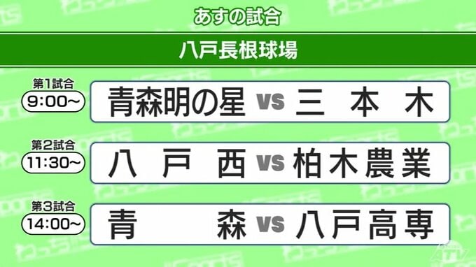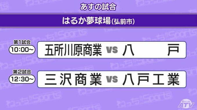 六戸メイプルは第1試合が五所川原工科と大間の一戦、プロ注目のピッチャー成田率いる弘前工業は三本木農業恵拓と対戦します。