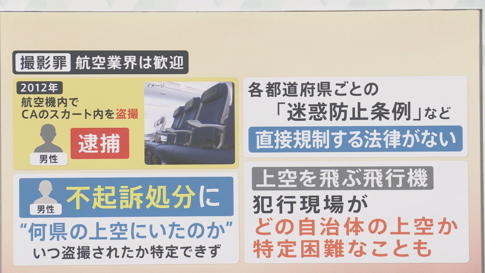 2012年、航空機内でCAのスカート内を盗撮した男性が逮捕されましたが、不起訴処分になった。なぜか。▼“どこの県”の上空にいたのか、▼“いつ”盗撮されたのか、特定することができなかったから。当時は、全国一律に取り締まることができなかった。